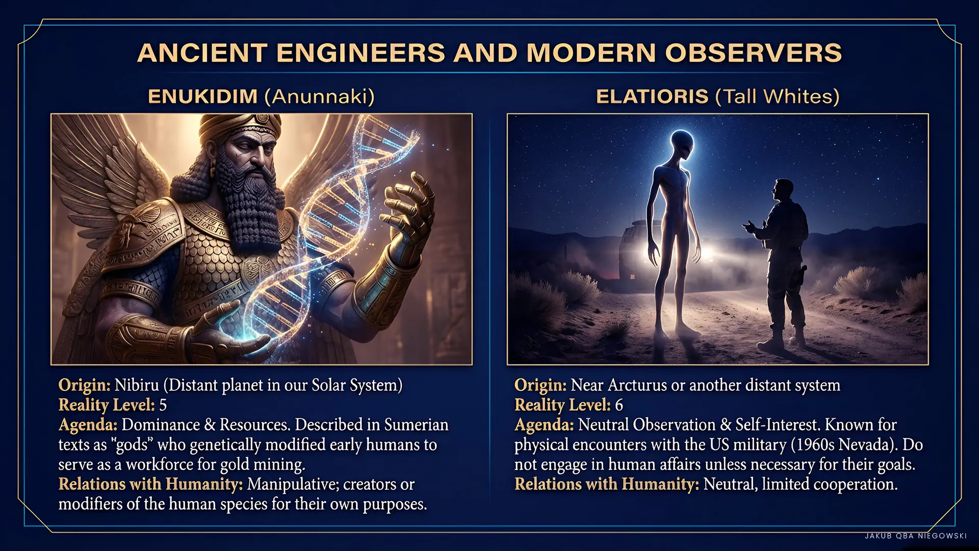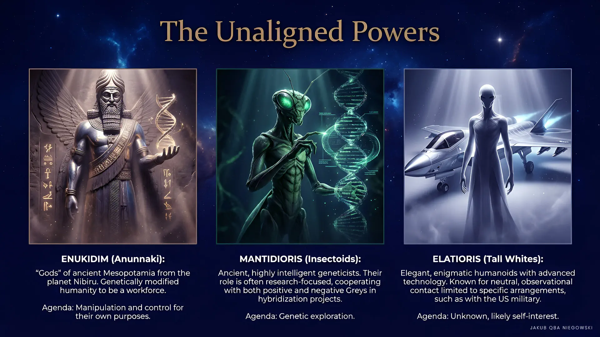 Distinguishing features: Ancient and technologically advanced race, considered “gods” in ancient Mesopotamian cultures. The Anunnaki are known for genetic manipulation and technological development.