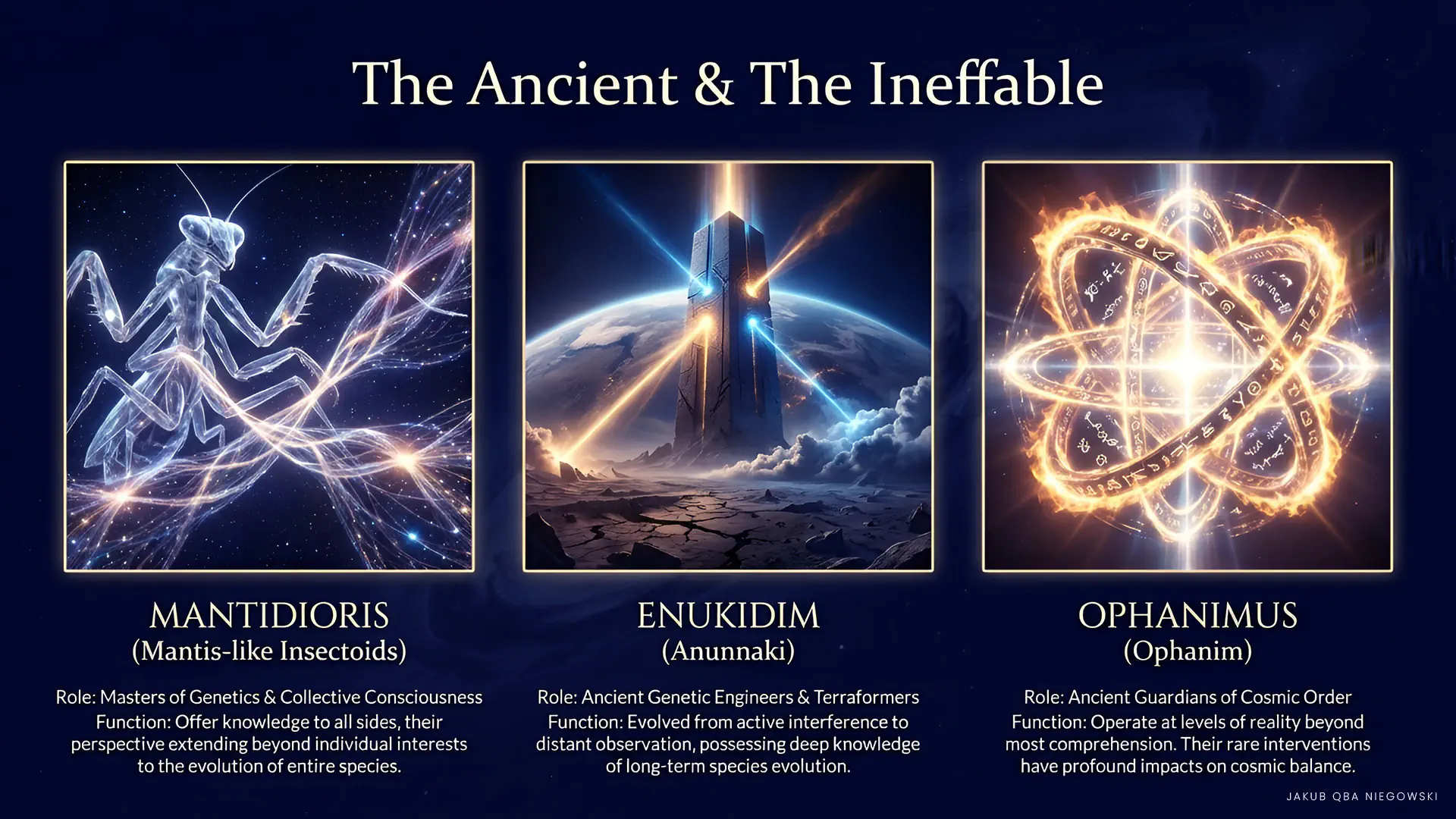 Relations with humanity: Manipulative, known for influencing humanity’s development through genetics and culture. Their interactions were both positive and negative, depending on context and goals.