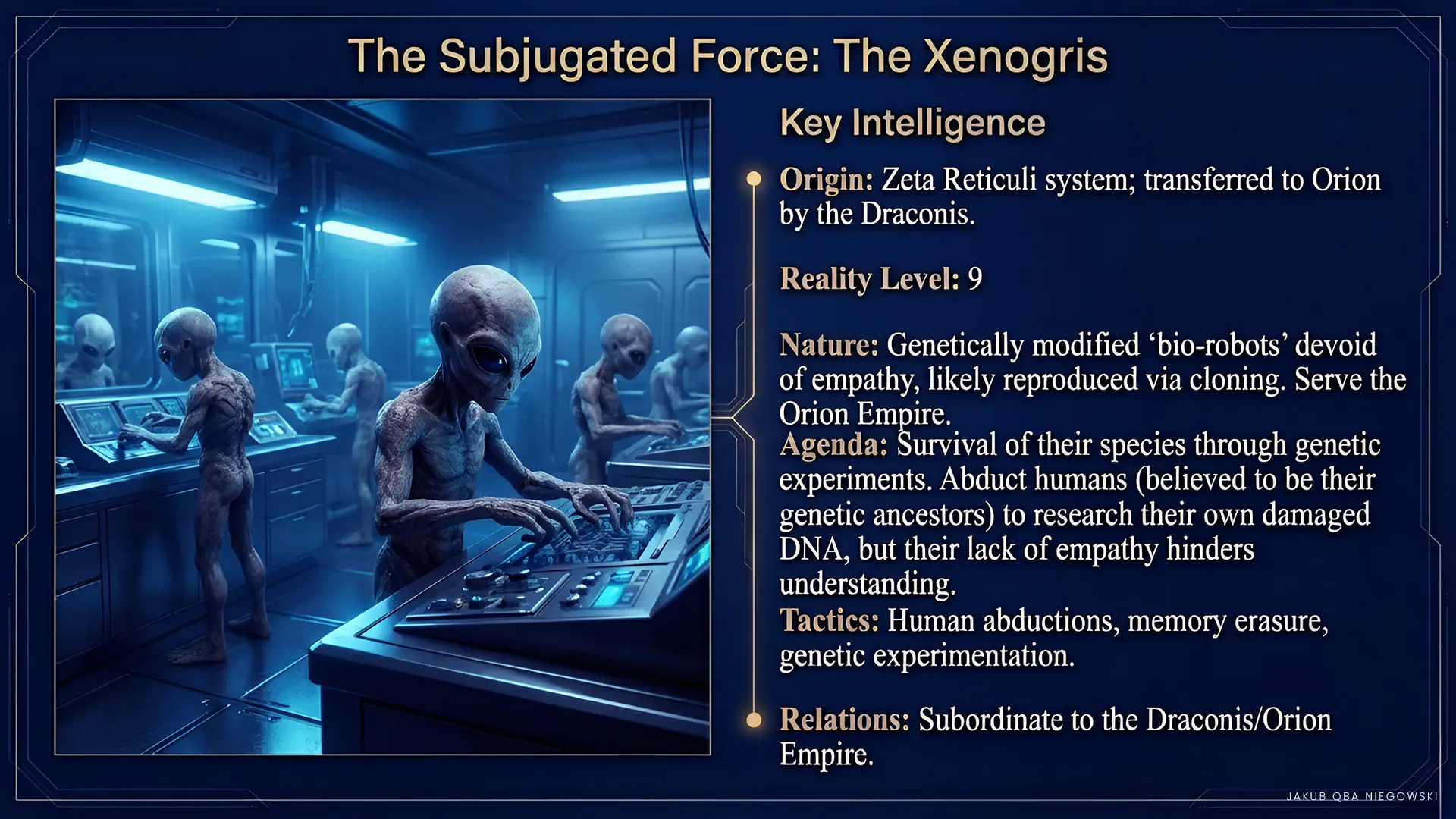 Distinguishing features: Oppressive, dominating, and manipulative beings, known for lack of respect for the free will of other races. Probable shape-shifting abilities or telepathic projection camouflaging and assimilating their physical appearance to representatives of the species they infiltrate. Probably the main force behind the “Orion Empire.”