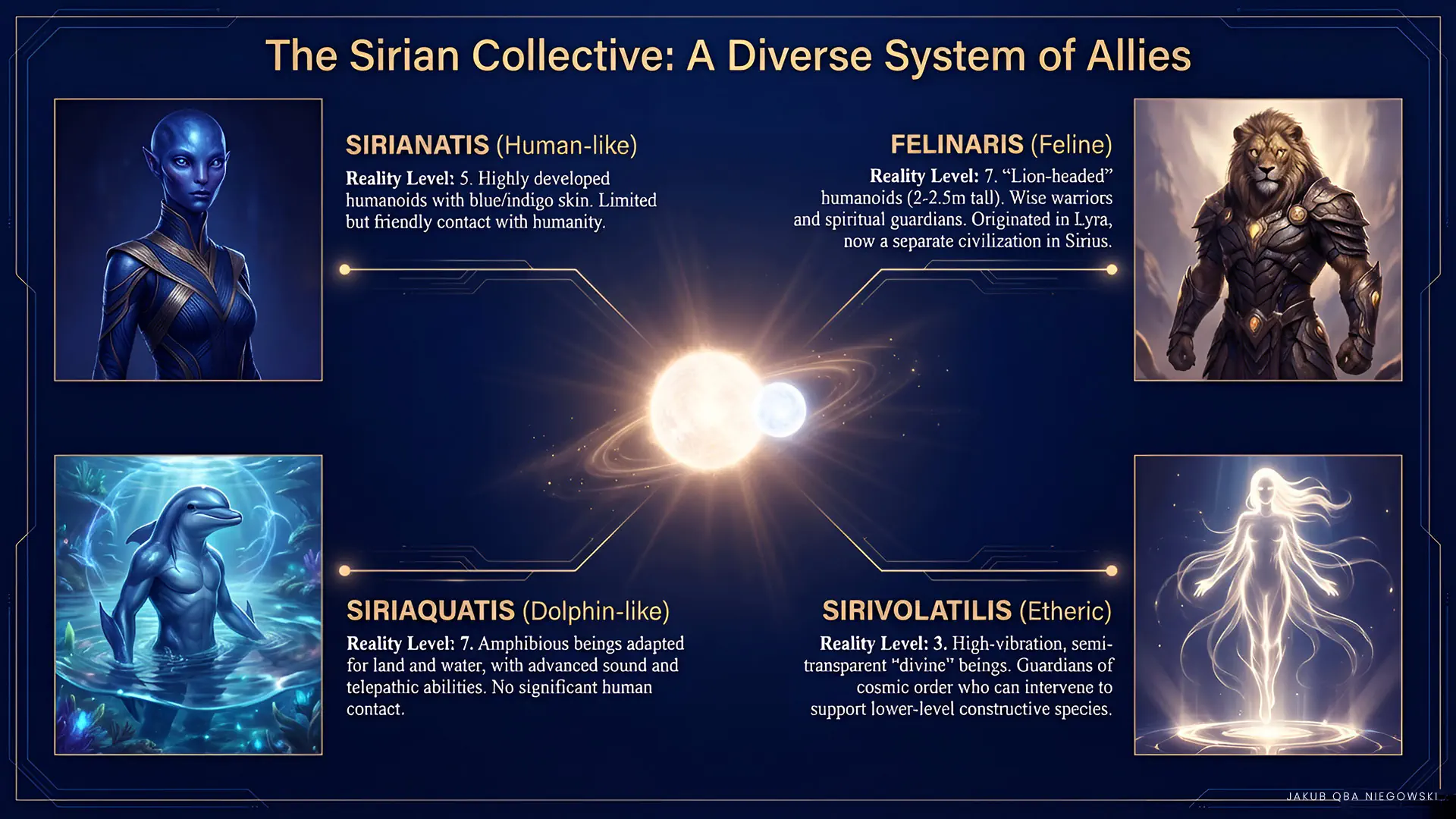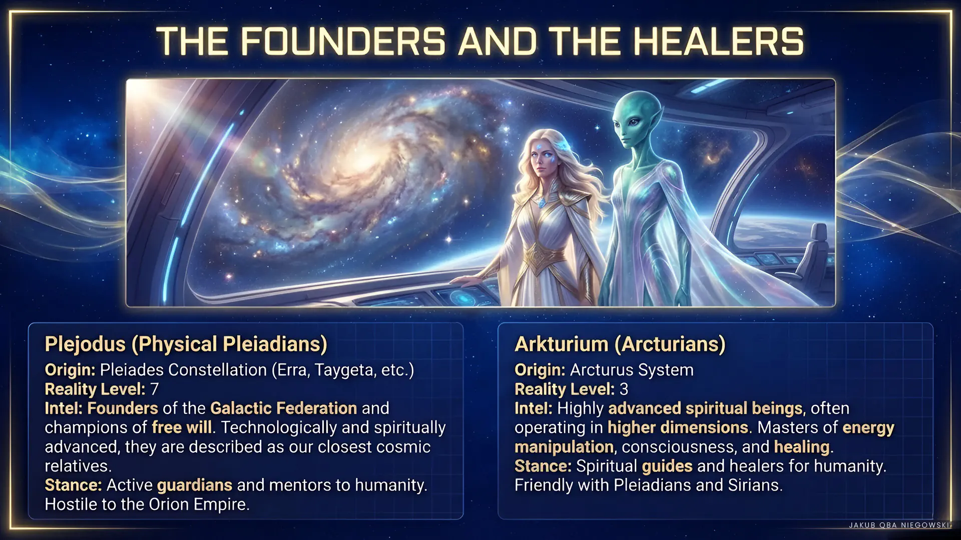 Distinguishing features: Advanced technologically and spiritually. A cosmic race known for their appearance resembling Nordic humans and their love of peace and freedom of choice, actively opposing the expansion of the Orion Empire. Founders of the Galactic Federation.