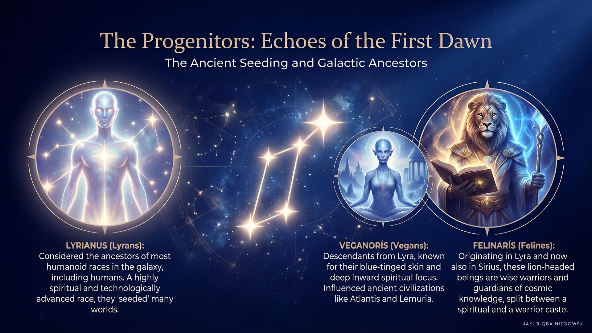 History and origin: Vegans, as one of the oldest cosmic races, achieved a high level of spiritual and technological development. They are ancestors of many humanoid races, including humans, and influenced ancient civilizations on Earth, such as Atlantis and Lemuria, through spiritual and physical contacts.
