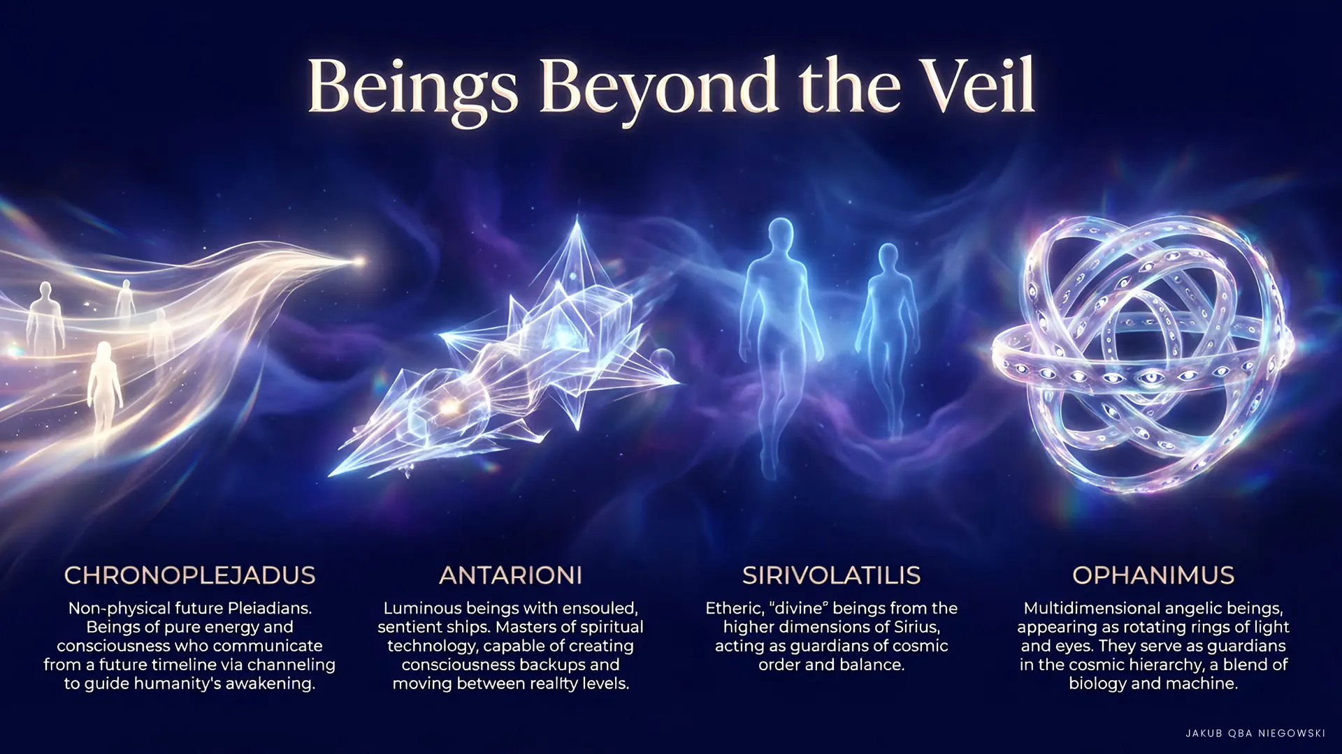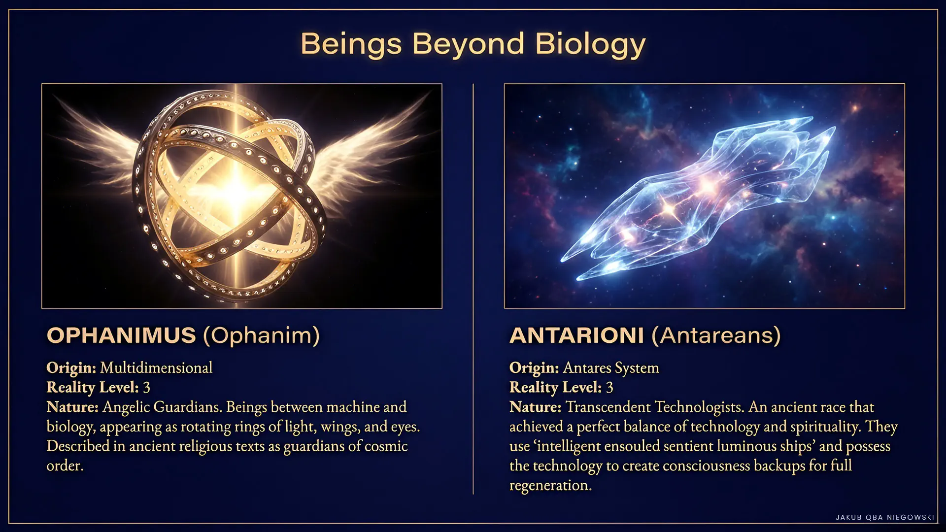 Distinguishing features: Multidimensional, complex multilayered beings often appearing as rotating rings with many eyes around them, appearing as life forms between machine and biology, combining both features. Associated with concepts of angels in various religious traditions.