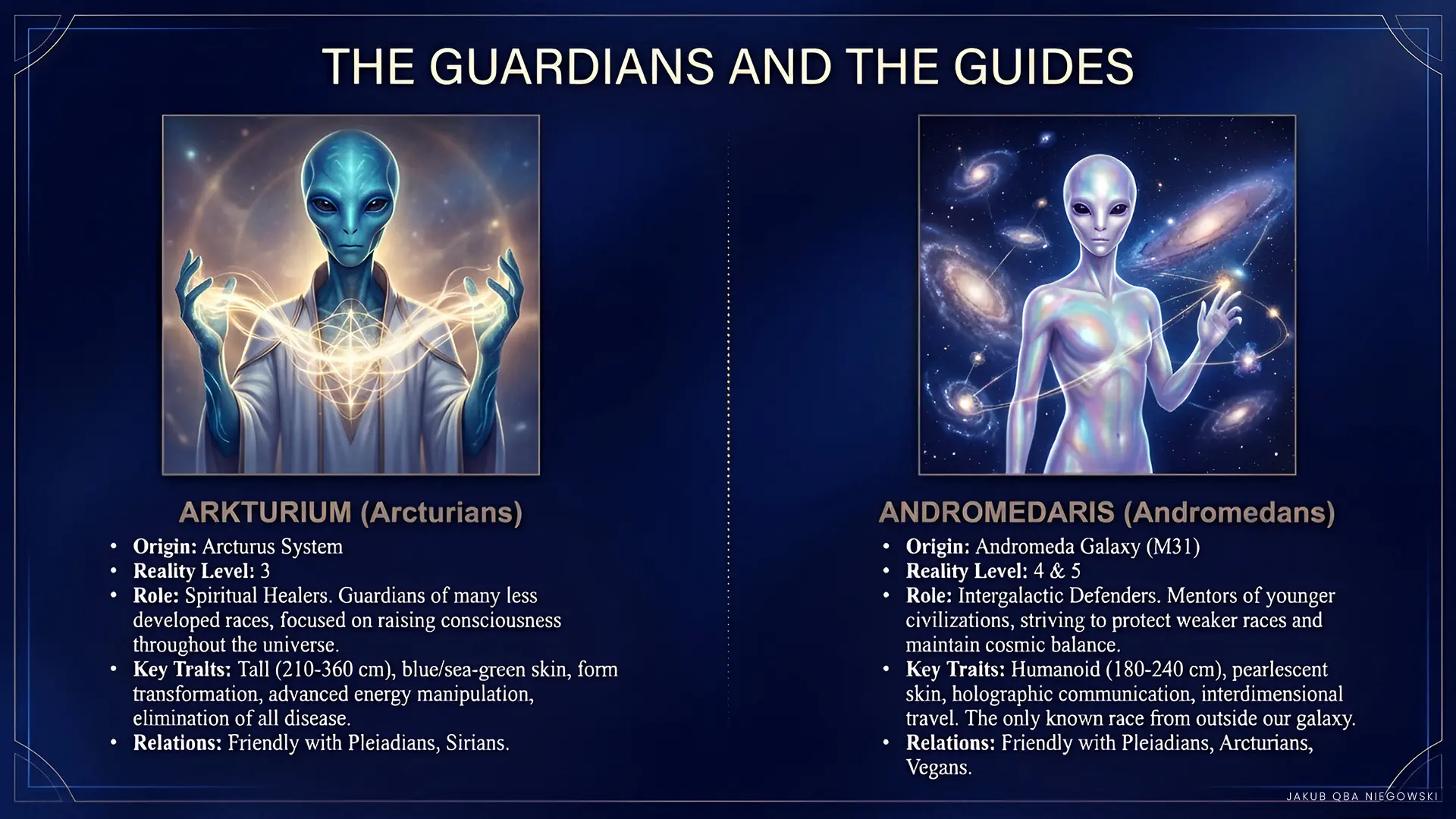 Distinguishing features: Andromedans are known for advanced technology and deep spirituality. As the only cosmic race, they declare themselves to be arrivals from another galaxy, specifically Andromeda. They act as defenders and mentors of younger civilizations, striving for balance and harmony in the universe.
