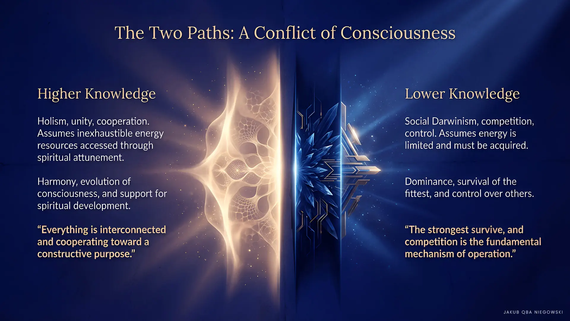 - Description: Lower Knowledge is an understanding of reality based on the need for control, power, and competition. It focuses on survival and dominance both in the physical world and in lower energy realms, such as the lower astral worlds. This is knowledge that assumes energy resources are limited and must be acquired through competition and control, usually at the expense of other living beings.