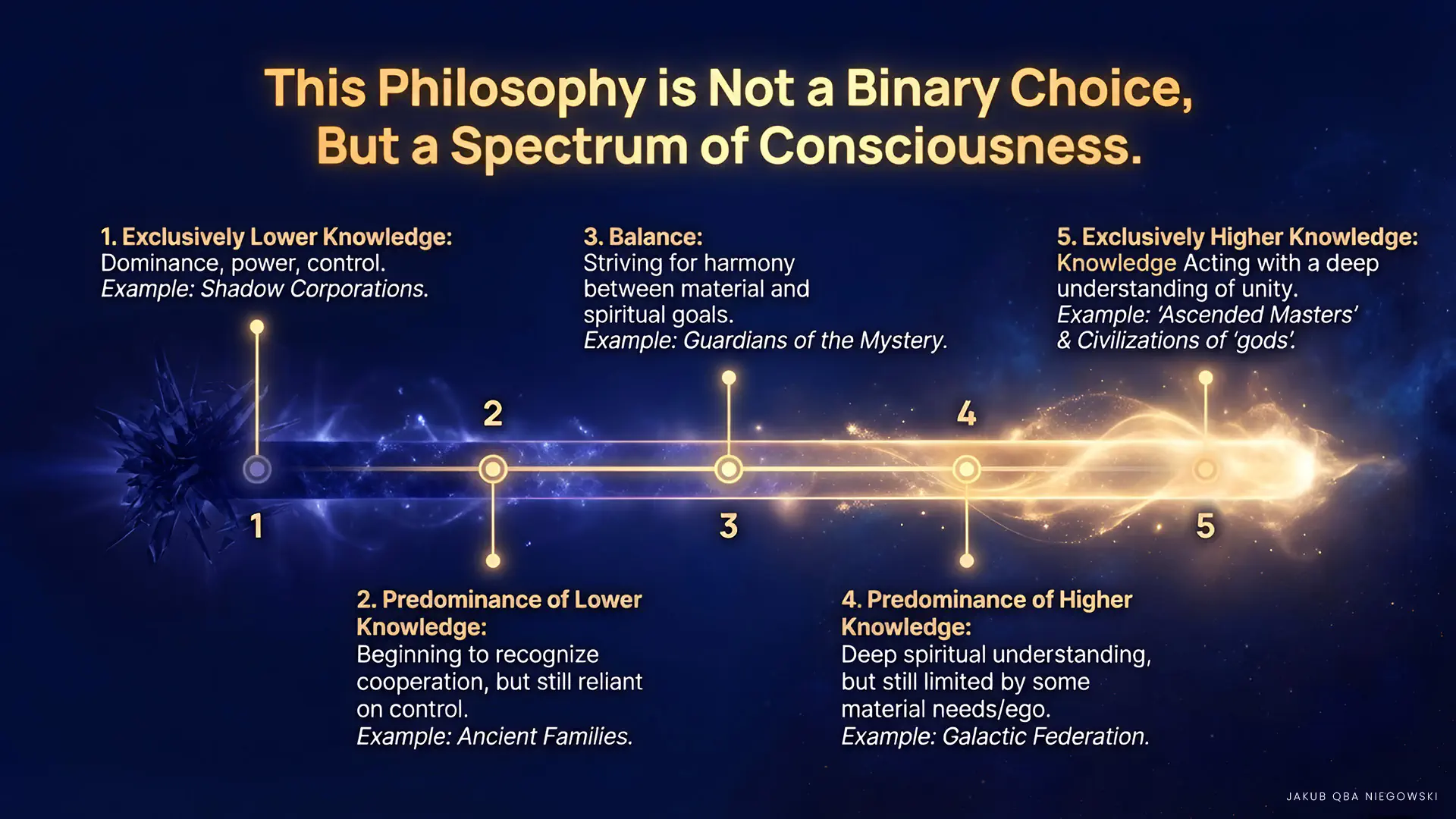 - Philosophy: Based on holism, where everything is interconnected and cooperating toward a constructive purpose. Viewing the world as an integrated whole, where every being has its place and significance. However, this often involves trivializing the suffering of individuals who are representatives of Lower Knowledge due to a lack of understanding of their perspective arising from Lower Knowledge and a different type of consciousness.