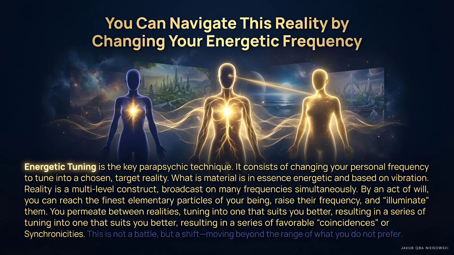 And now what is very important to understand: Reality is a multi-level construct, encompassing many frequencies. Figuratively speaking, it is as if our world were something broadcast on many radio or television stations simultaneously. These stations usually differ only slightly from each other. They differ in events and qualities of life. This is, of course, about the theory of alternative worlds, alternative timelines and events. However, unlike films in which characters travel between alternative worlds and immediately notice significant differences—we ourselves, also experiencing this—usually do not even notice it. Why? Because unlike film stories—the alternative realities between which we move naturally—are close to each previous one we were in, and therefore so similar to each other that we usually do not notice or feel the moment of transition. This transition—this is precisely Energetic Tuning—changing our frequency and tuning into other qualities.