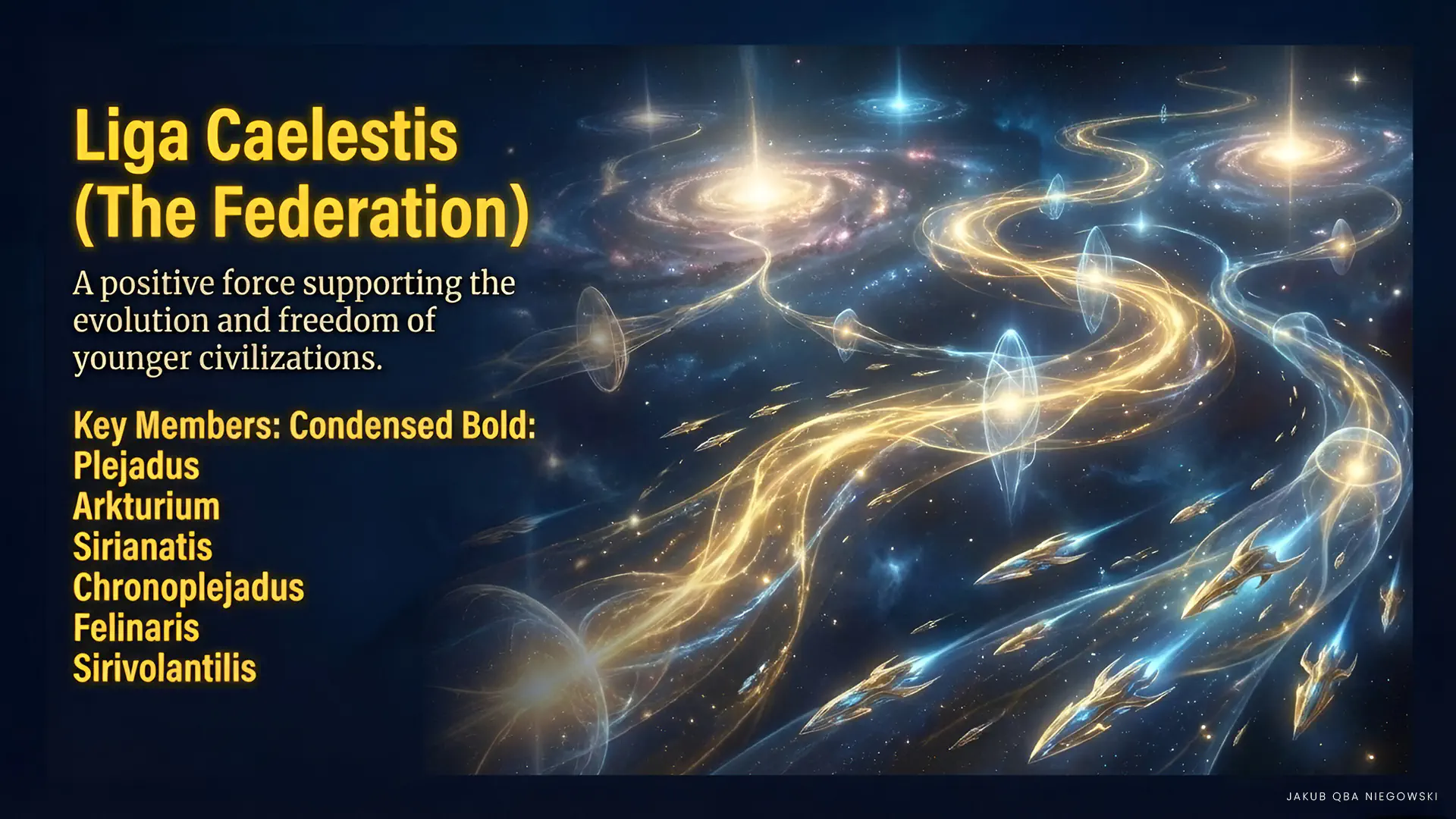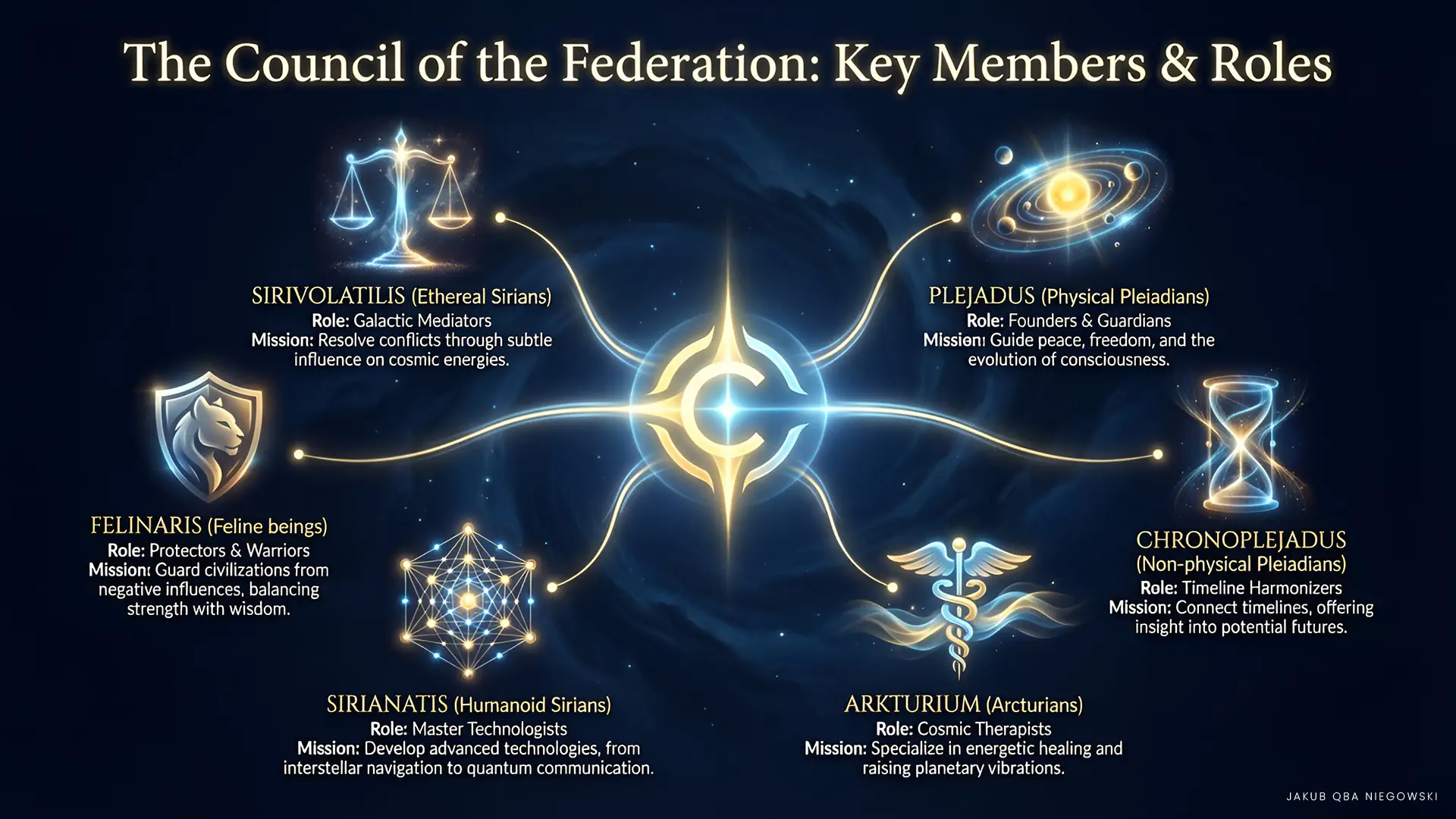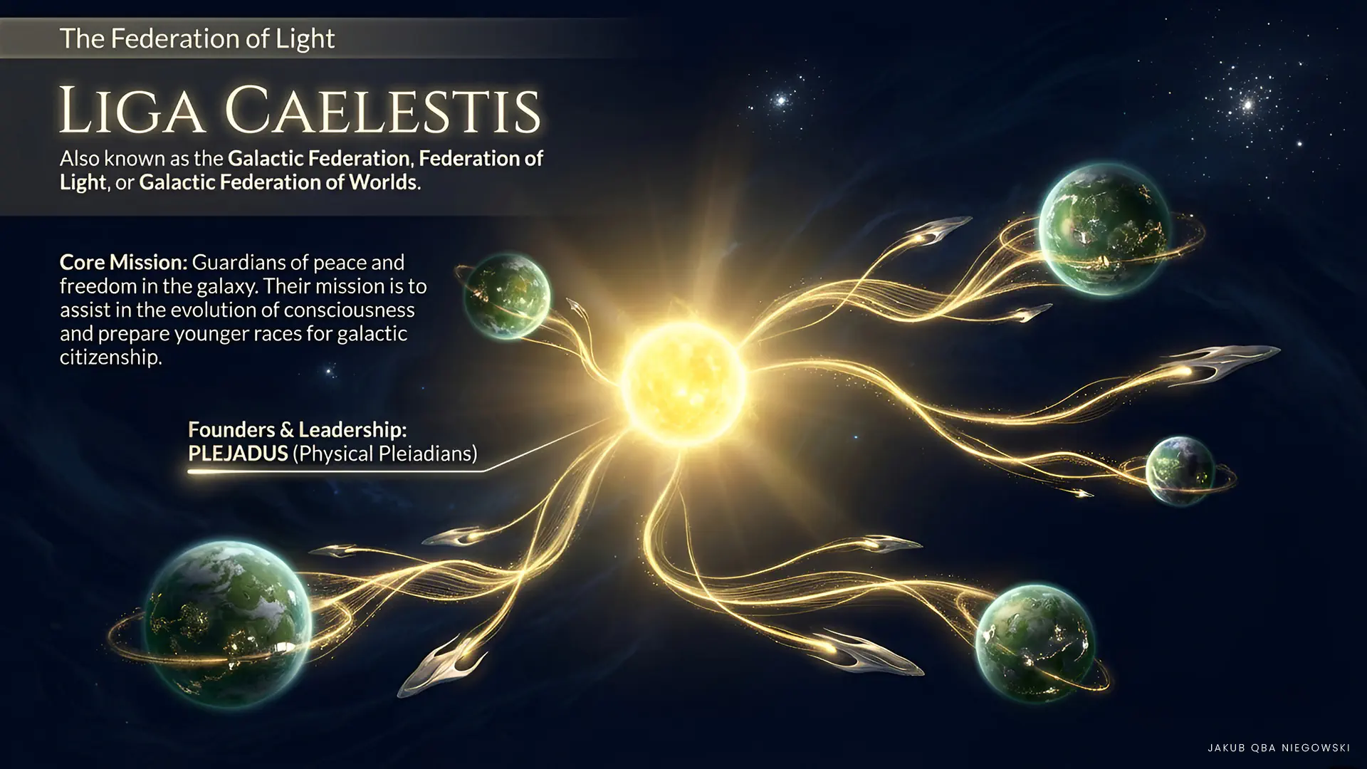• PLEJADUS (Physical Pleiadians) Founders and main leaders of the Federation. They serve as guardians of peace and freedom in the galaxy. They offer support to developing civilizations, including humanity. Their mission is to assist in the evolution of consciousness and prepare younger races for galactic citizenship.