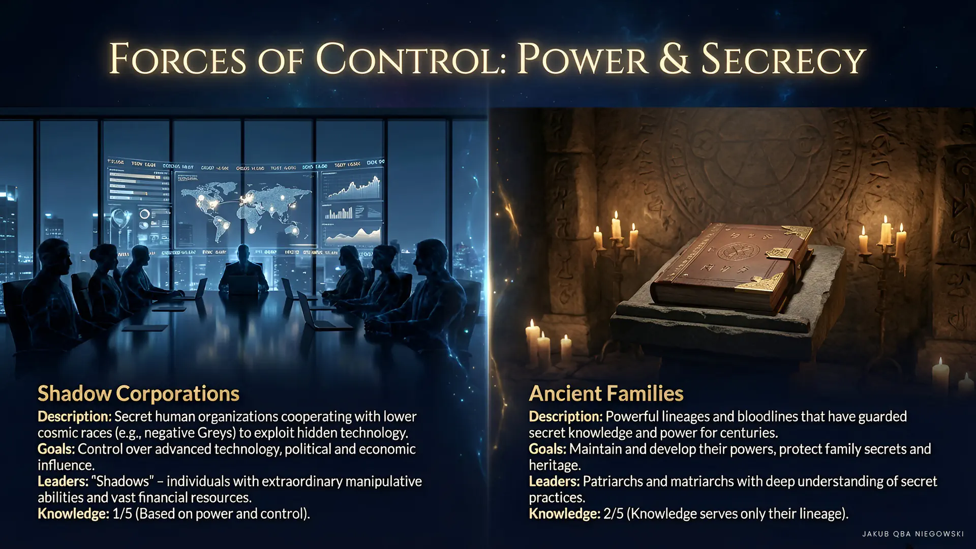 • Description: Secret human organizations cooperating with lower cosmic races, such as negative Greys, striving to exploit hidden technology for their own purposes.