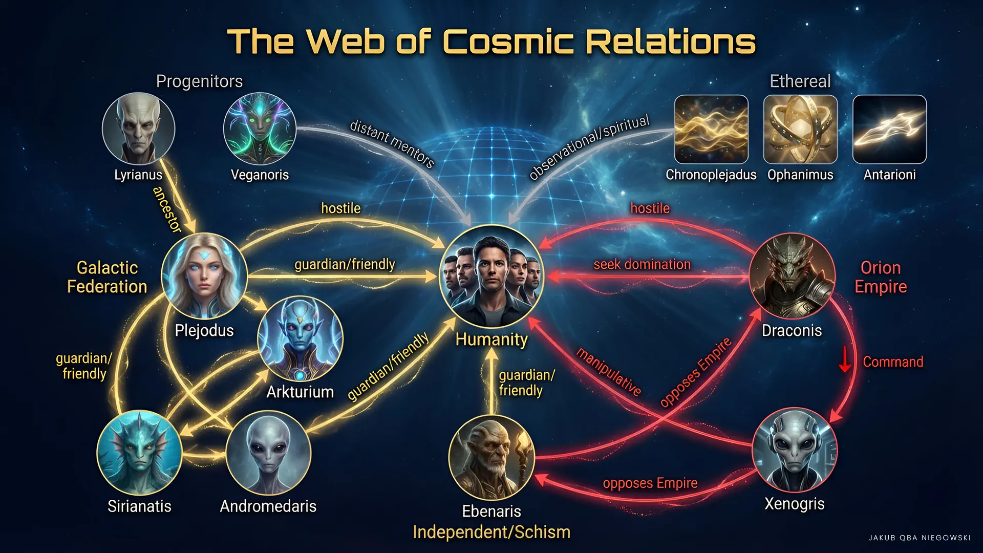 The description below presents the known state at the time of writing this information. You may discover new alliances and relationships between various cosmic races and factions.