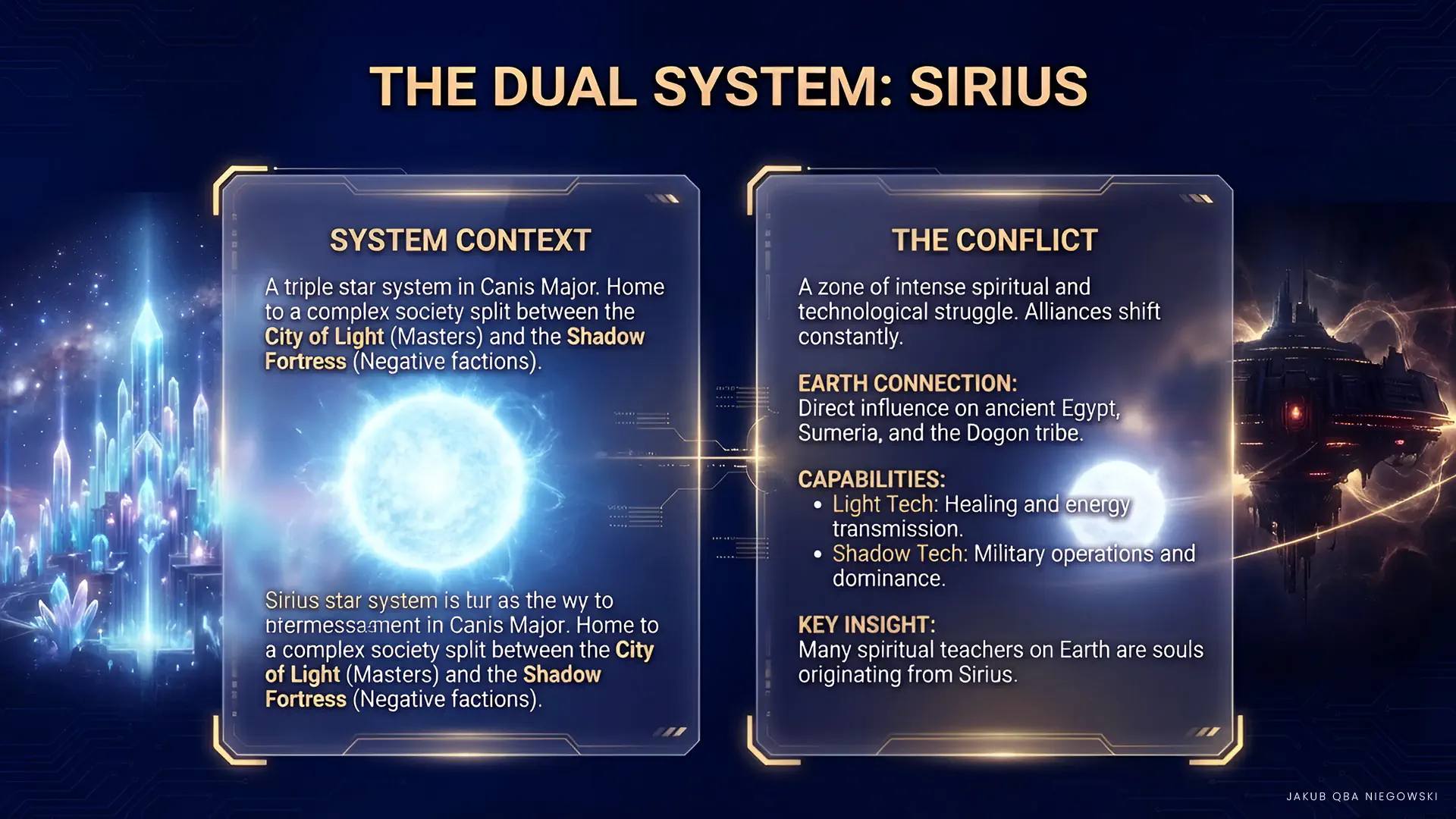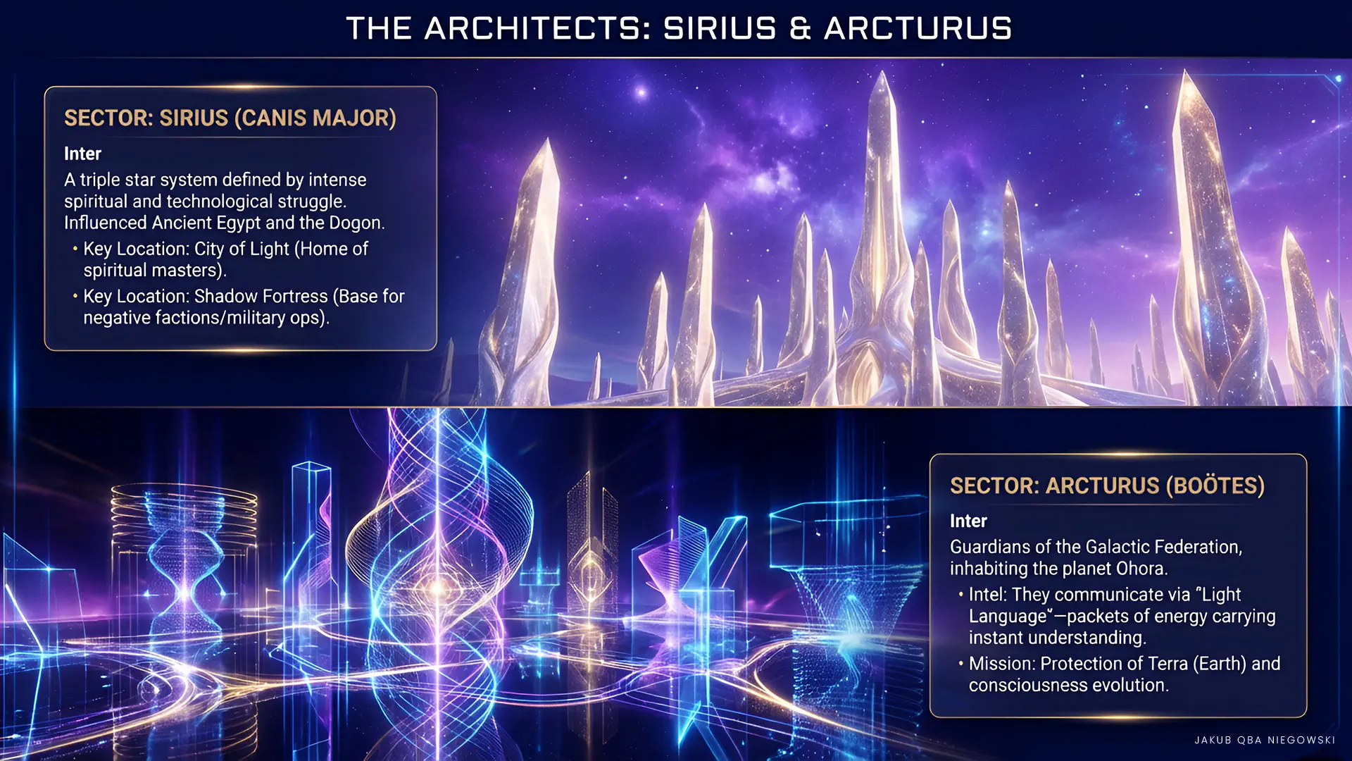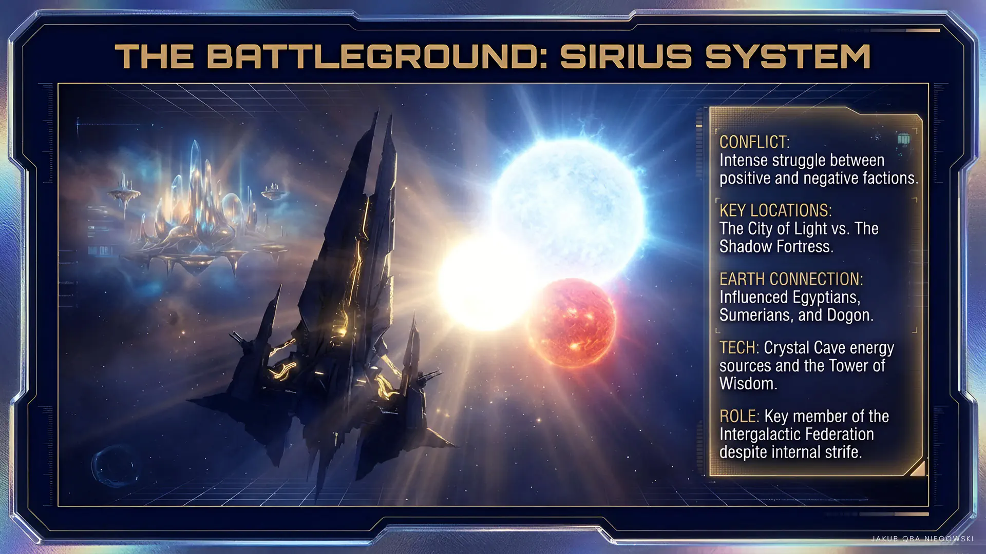 The triple star system of Sirius, located in the constellation Canis Major, is home to various civilizations and factions, both positive and negative. It is a place of intense spiritual and technological struggles, often perceived as a center of ancient wisdom and advanced knowledge.