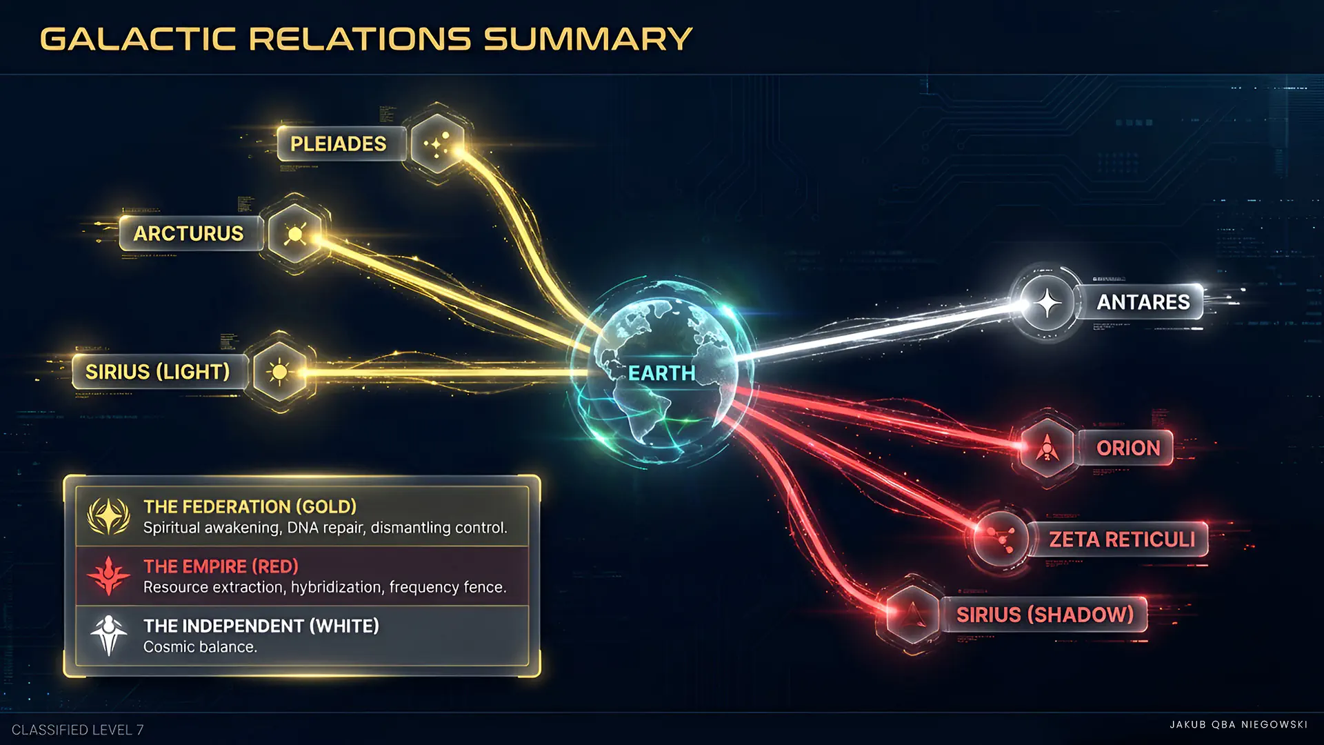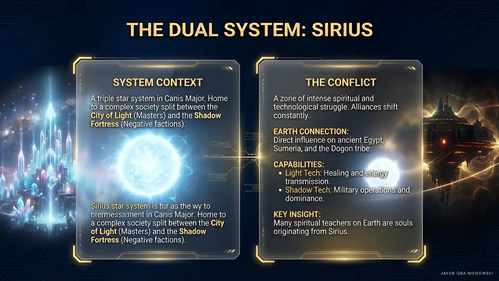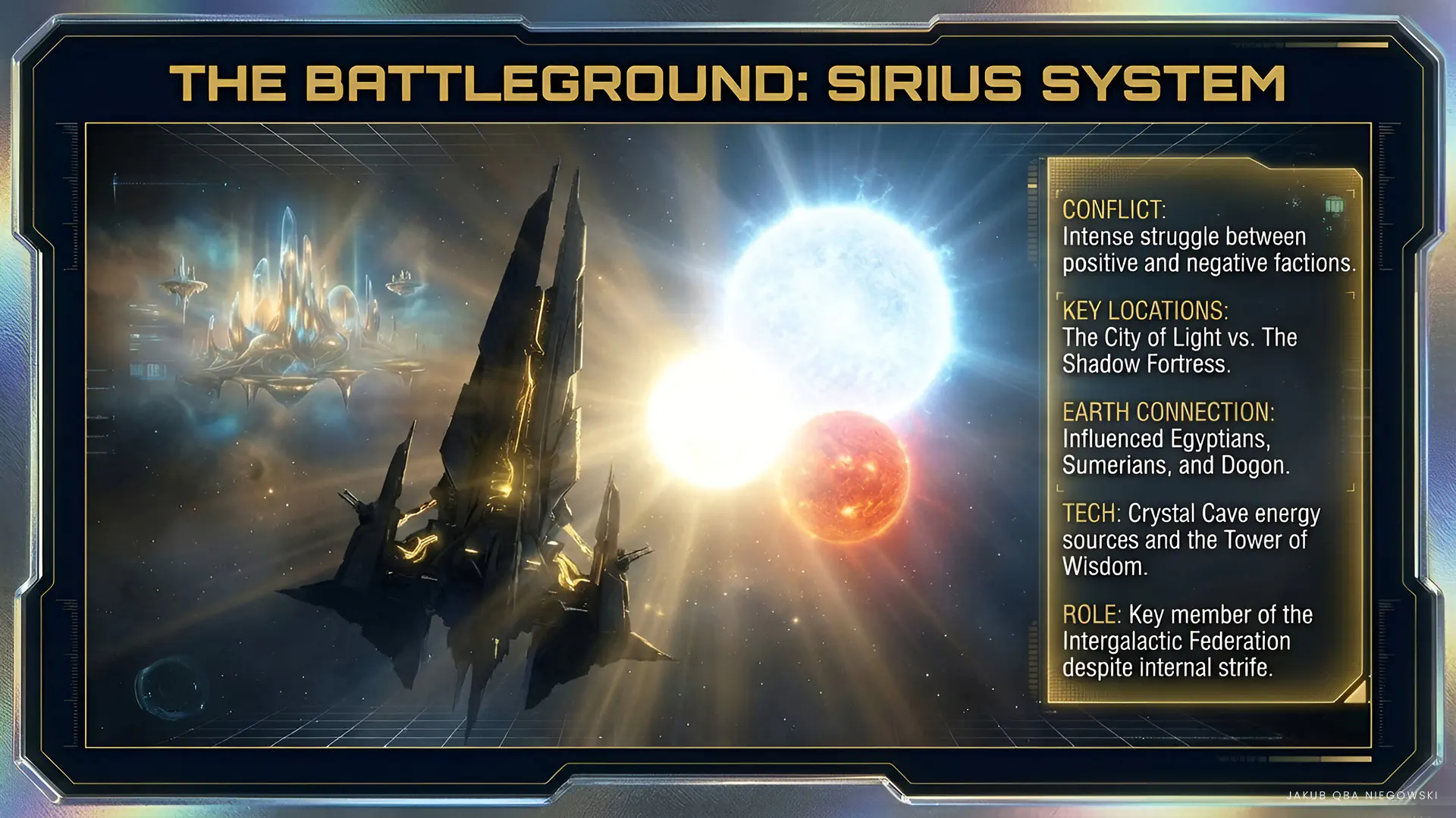 The triple star system of Sirius, located in the constellation Canis Major, is home to various civilizations and factions, both positive and negative. It is a place of intense spiritual and technological struggles, often perceived as a center of ancient wisdom and advanced knowledge.