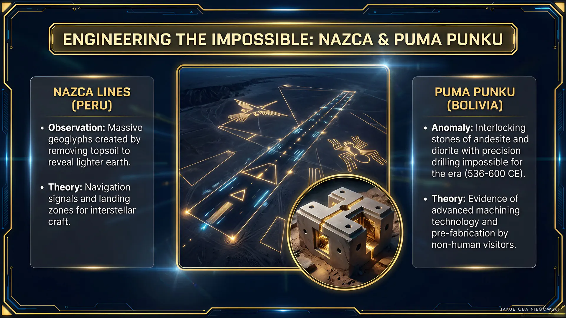 Puma Punku is an ancient complex of stone structures in Bolivia, part of the larger Tiwanaku complex, known for precise stonework that to this day arouses admiration and speculation about its construction. Many theories suggest that the advanced construction techniques used in its construction were not known to humanity of those times and could have originated from alien civilizations.