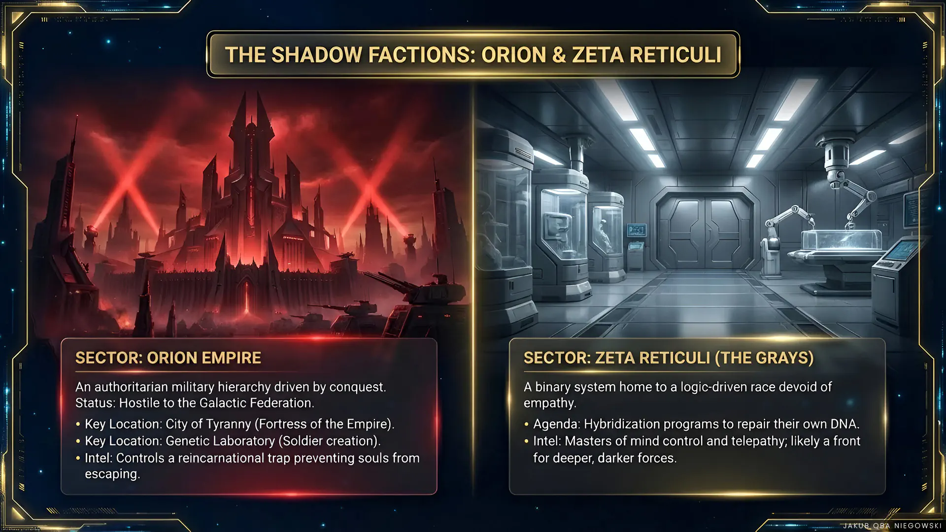 History and Significance: Orion is known for its aggressive policy of expansion and control. The Orion Empire has waged many wars with other civilizations, seeking dominance in the galaxy. Its strategy is based on military conquest and technological superiority. The Orion Empire is a hostile camp toward the Galactic Federation and wages both hot and cold wars with it for influence on many worlds.
