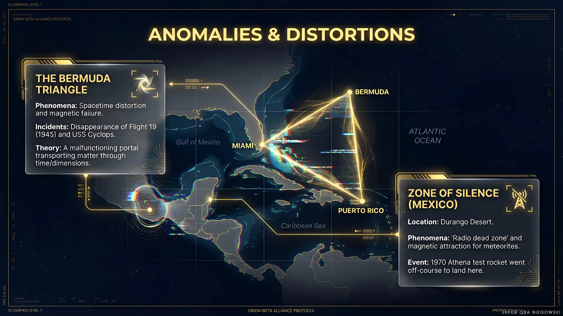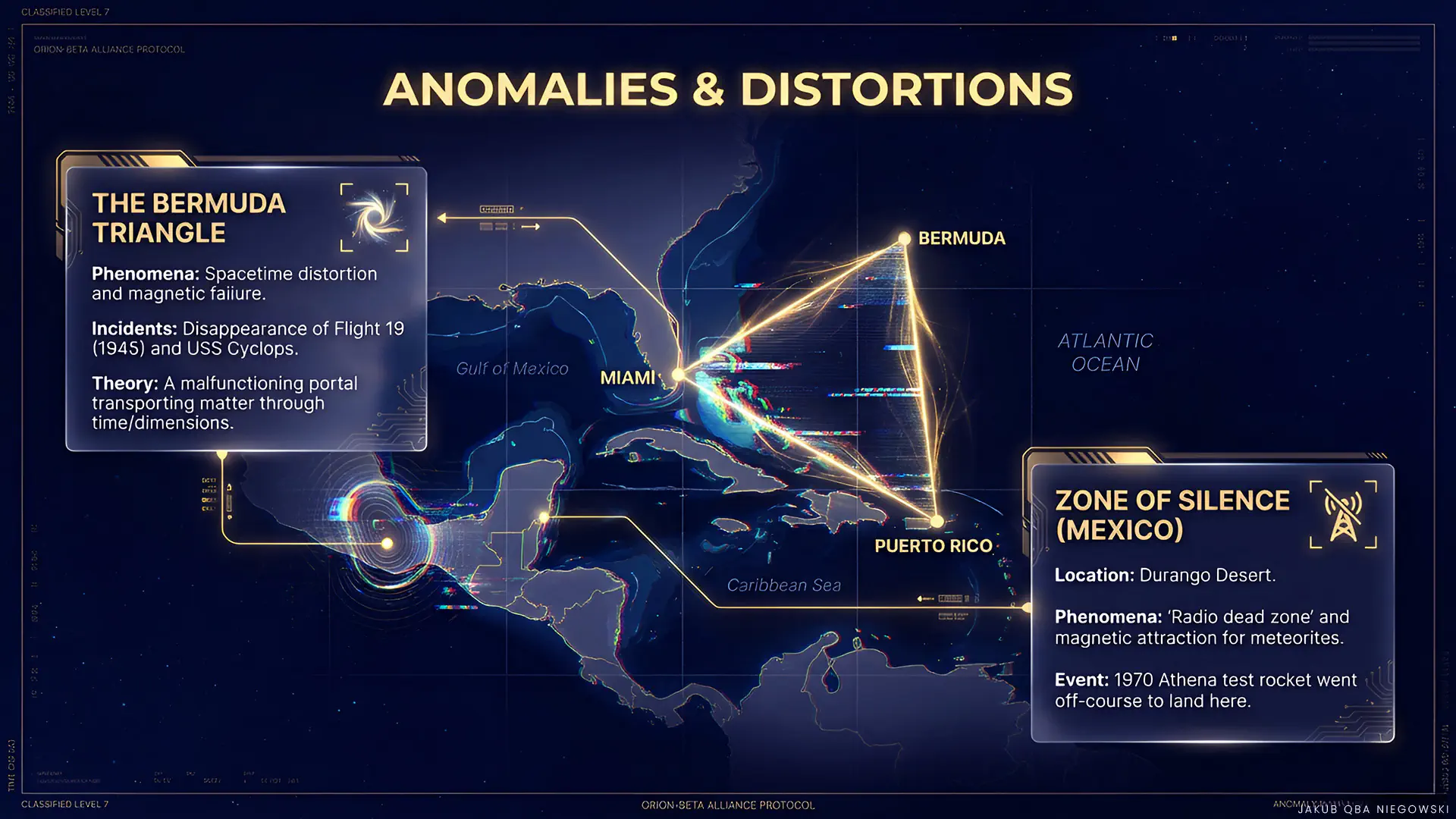 A mysterious area in the Atlantic, also known as the Bermuda Triangle, covers approximately 500,000 square miles of ocean between Miami, Bermuda, and Puerto Rico. This place is known for numerous disappearances of ships and aircraft, making it a subject of interest for organizations dealing with interdimensional research and paranormal phenomena.