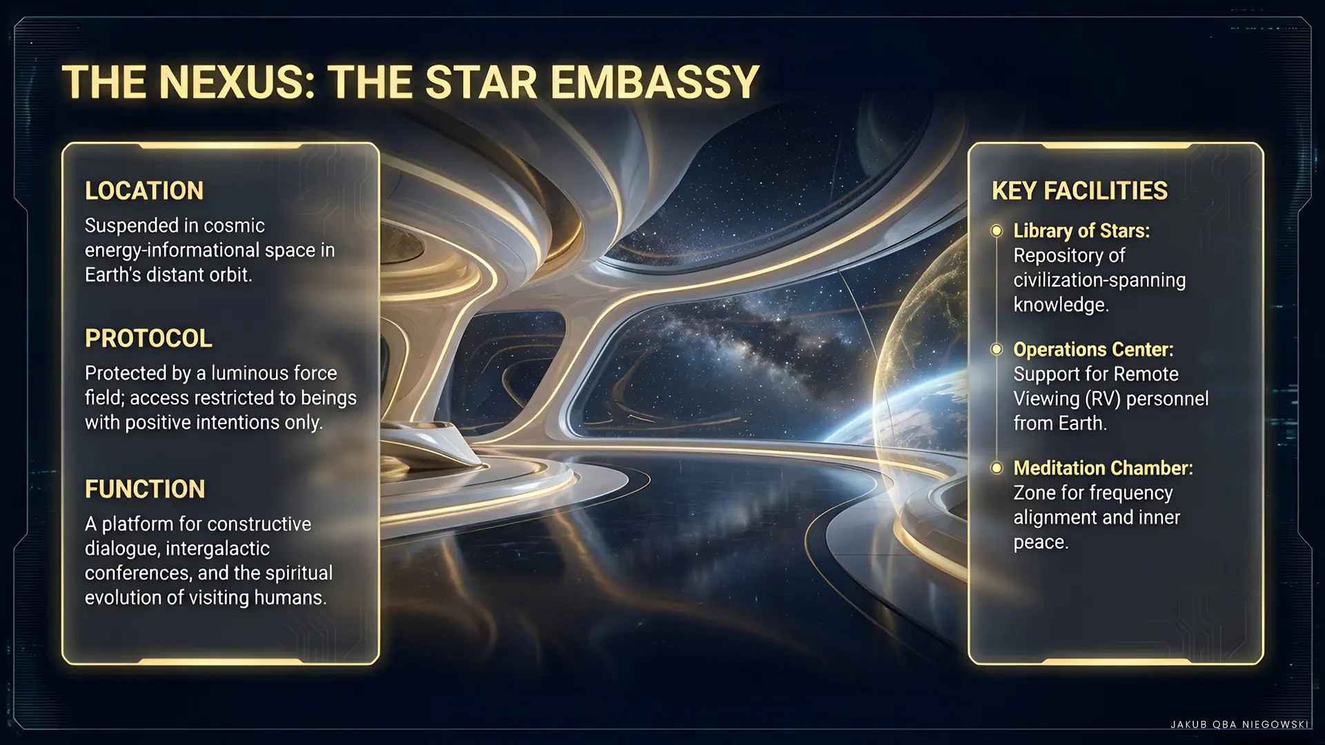 The Star Embassy is a place suspended in cosmic energy-informational space in Earth’s distant orbit, intended for humanity’s meetings with representatives of extraterrestrial civilizations. It serves as a platform for establishing constructive dialogue, exchanging information, learning, and developing humanity, as well as for the individual development of people visiting it. The Embassy is protected by a luminous force field that prevents access to persons with negative intentions. It is a place where only beings with good intentions can stay, serving development and mutual respect.