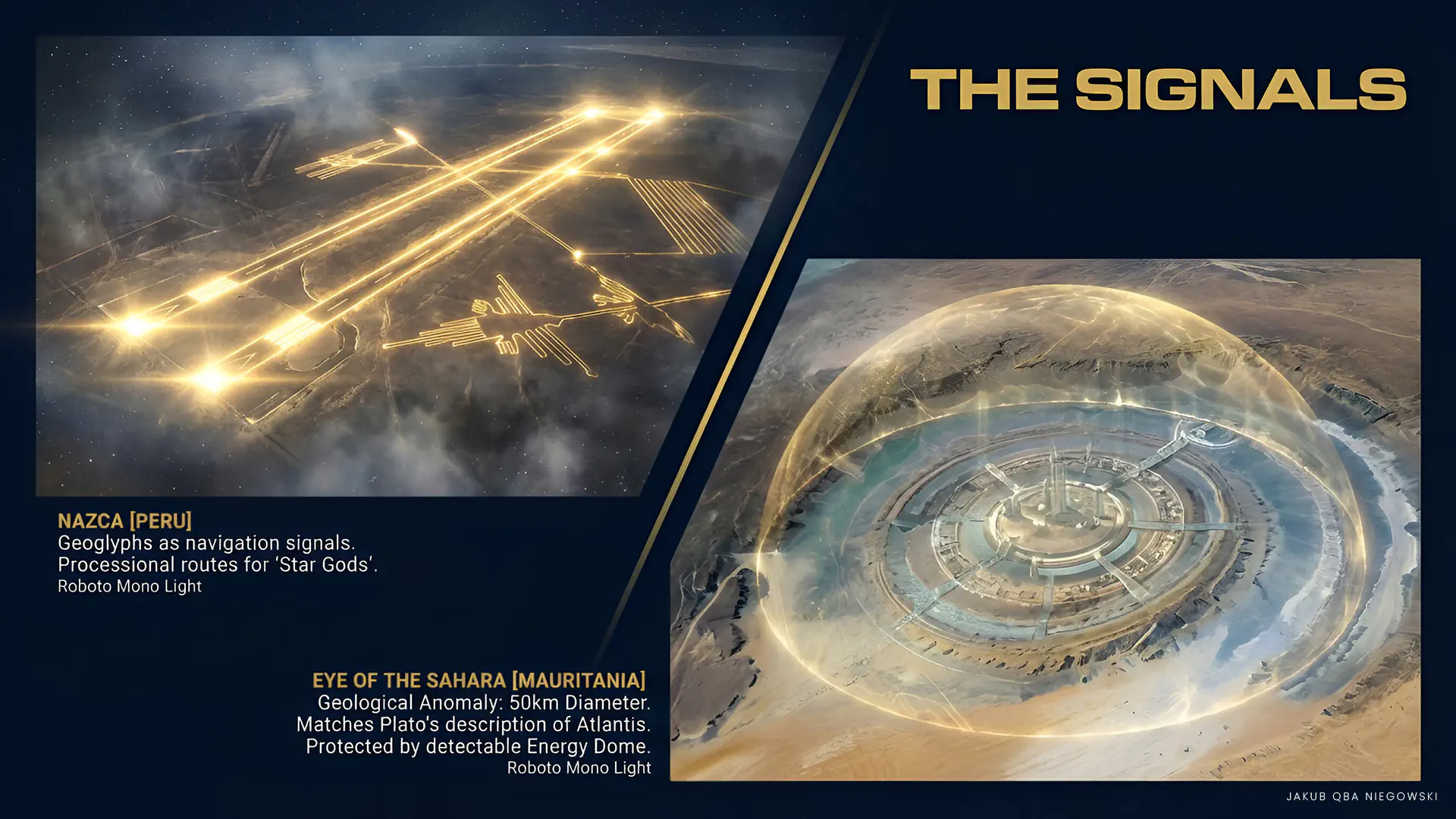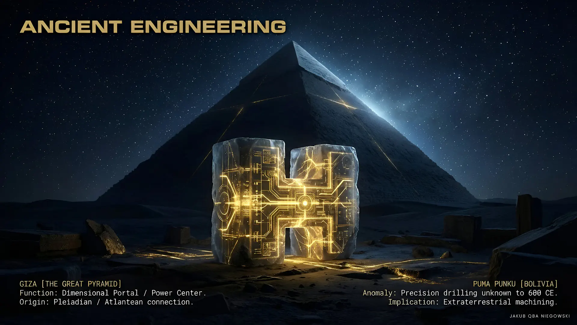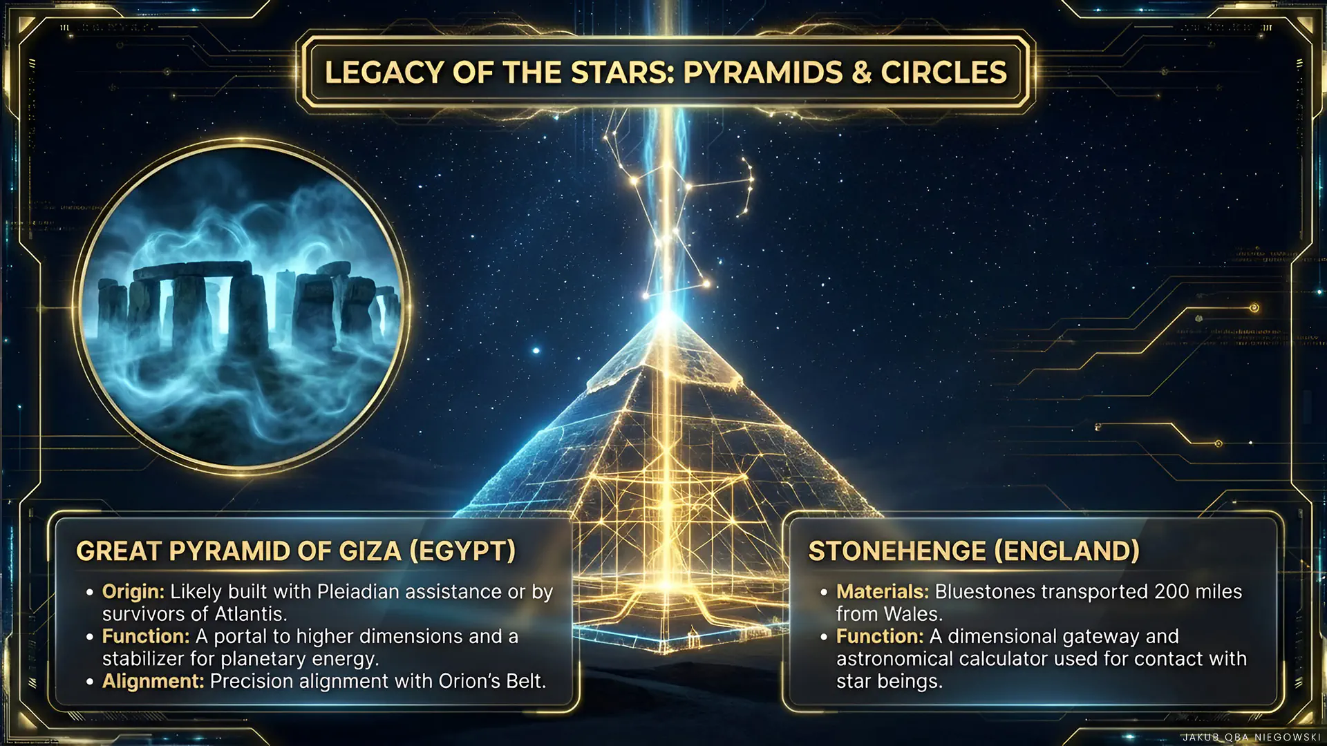 A monumental structure in Egypt, whose construction around 2600 BCE is officially attributed to Pharaoh Khufu. The Great Pyramid raises questions about possible help from outside, often associated with theories about Pleiadians and advanced technologies of alien civilizations. Its construction is considered technically advanced, and its precision arouses admiration to this day. There are also indications that behind the plans and execution of the construction stood one of the survivors of the fall of Atlantis, whose location is sought, among others, on the western edge of North Africa in the place known today as the Eye of the Sahara.