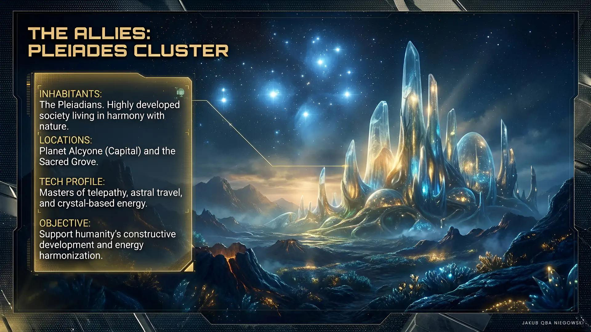 - Planet Alcyone: The capital of the Pleiades, where intergalactic meetings and conferences take place, the administrative and political center.
