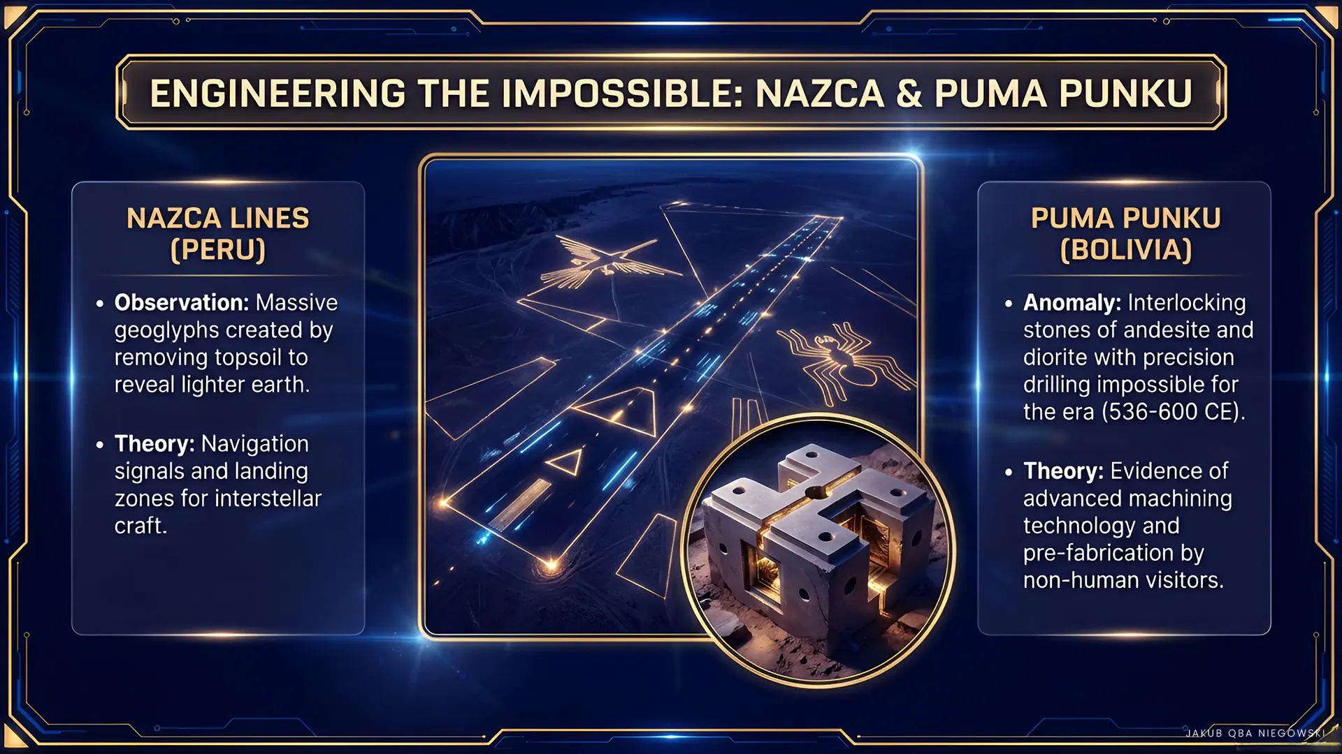 The Nazca Lines are a set of ancient geoglyphs in Peru, visible mainly from the air, depicting various animals, geometric figures, and straight lines. Theories suggest they could have served as navigation signals for alien civilizations, and some researchers consider them evidence of contact with representatives of extraterrestrial civilizations. According to some theories, the geoglyphs were created as landing sites for alien craft or messages sent into space.