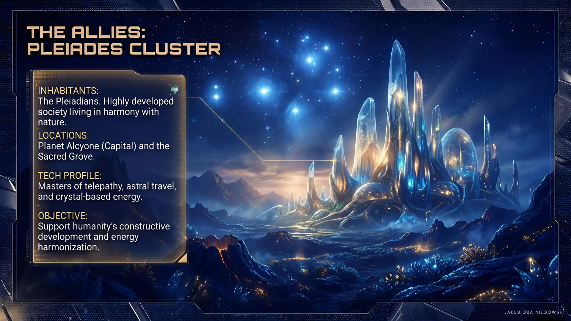 History and Significance: The Pleiades have long been considered the cradle of spiritual development and advanced technology. According to gathered information, the Pleiadians have contacted many ancient civilizations on Earth, transmitting knowledge and technology to them. In ancient texts, such as Greek mythology, the Pleiades are often portrayed as divine beings who influenced the development of humanity.
