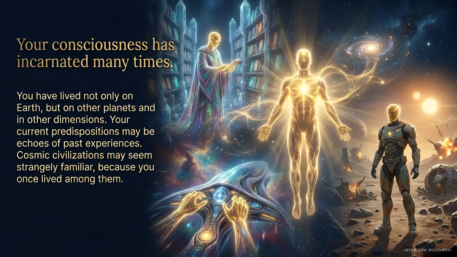 Moreover, your consciousness has incarnated many times, not only on Earth, but also on other planets and in other dimensions. Some of your current predispositions may result from experiences from previous incarnations, and among cosmic civilizations there are many that may seem strangely familiar to you, because you once lived among them or your race at that time had some relations with them.
