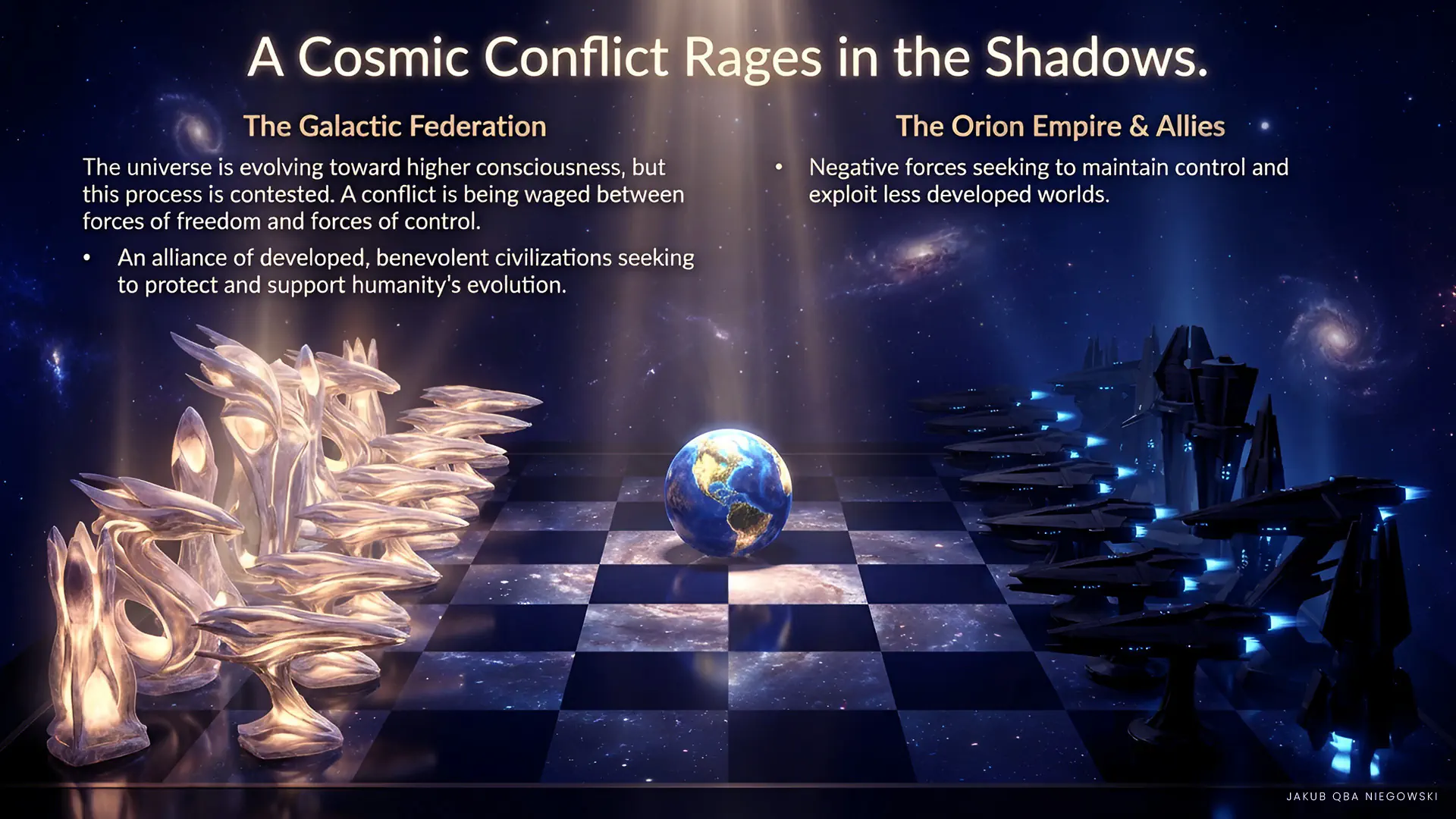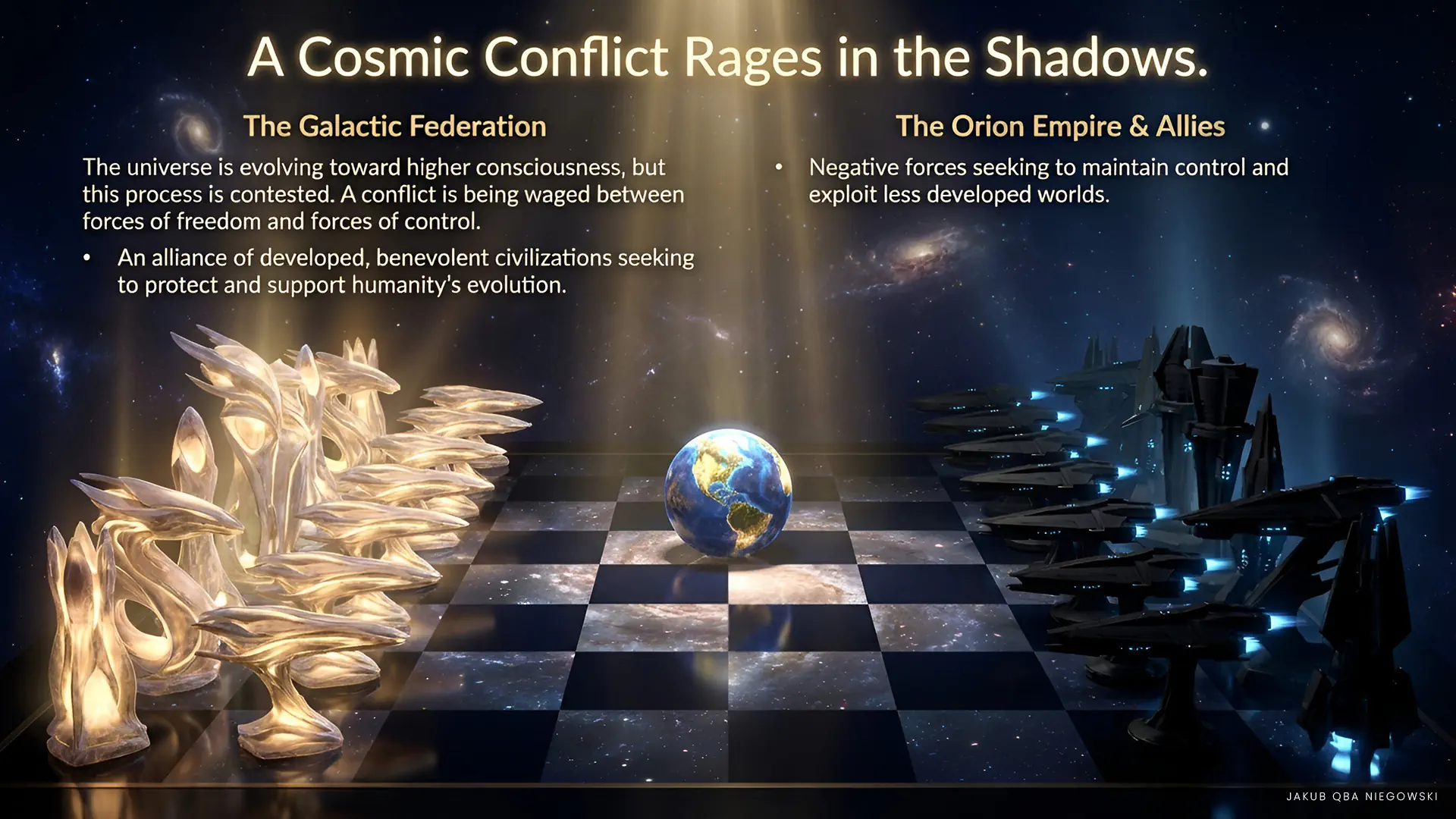 In the background, a cosmic conflict rages between forces of light and darkness, freedom and control. The Galactic Federation, uniting the most developed civilizations friendly to humanity, seeks to protect and support our development. On the other hand, the Orion Empire and other negative forces seek to maintain control and exploitation of less developed worlds.
