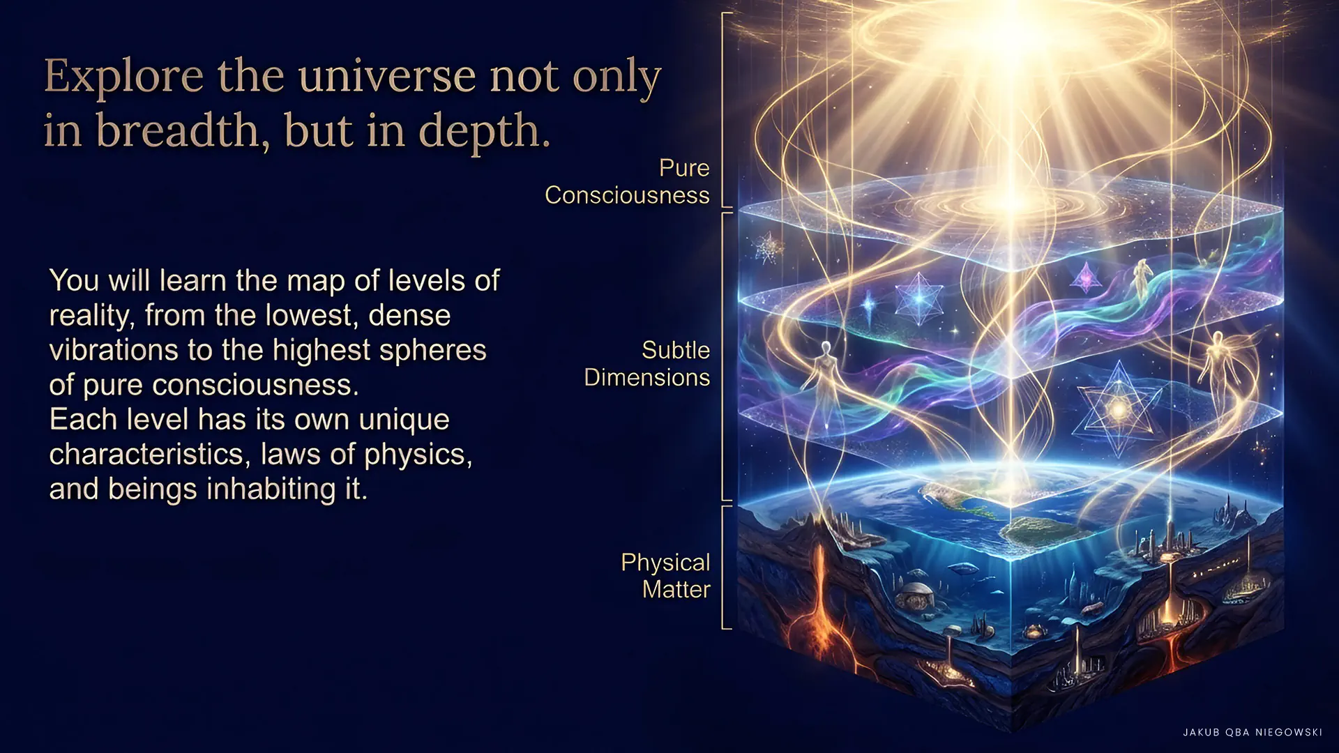 In subsequent chapters, you will learn a detailed map of levels of reality. From the lowest, dense vibrations of so-called physical matter, through subtle dimensions, to the highest spheres of pure consciousness. Each level has its unique characteristics, laws of physics, and beings inhabiting it.