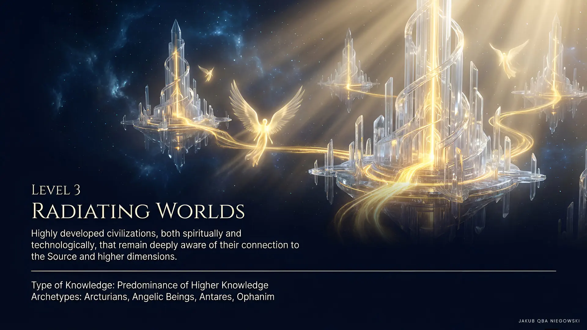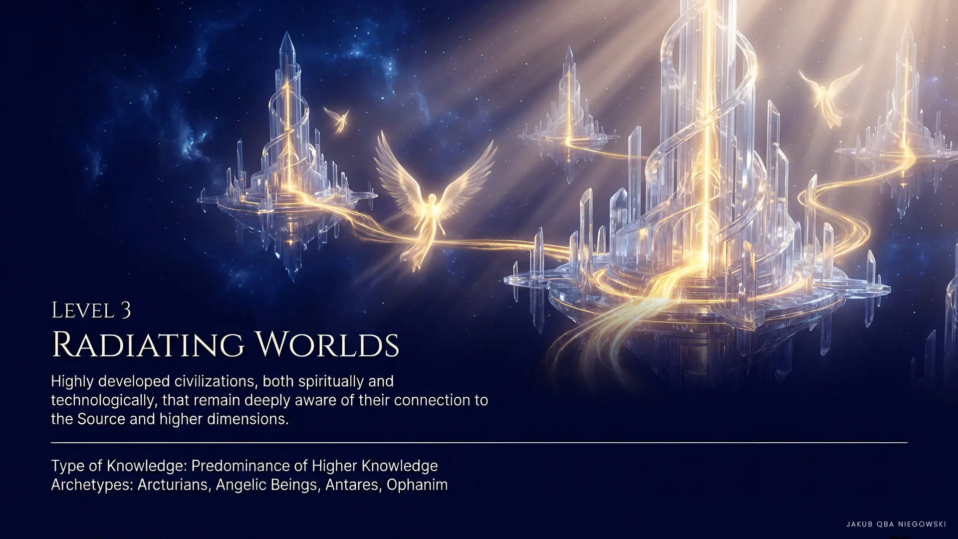 - Description: High degree of civilization development in spiritual terms, sometimes also still using advanced technologies. Worlds very aware of their connection with the whole, higher dimensions, and the Source itself.Protective beings, characterized by very high vibration and deep understanding of the Source, distinguished by spiritual wisdom.