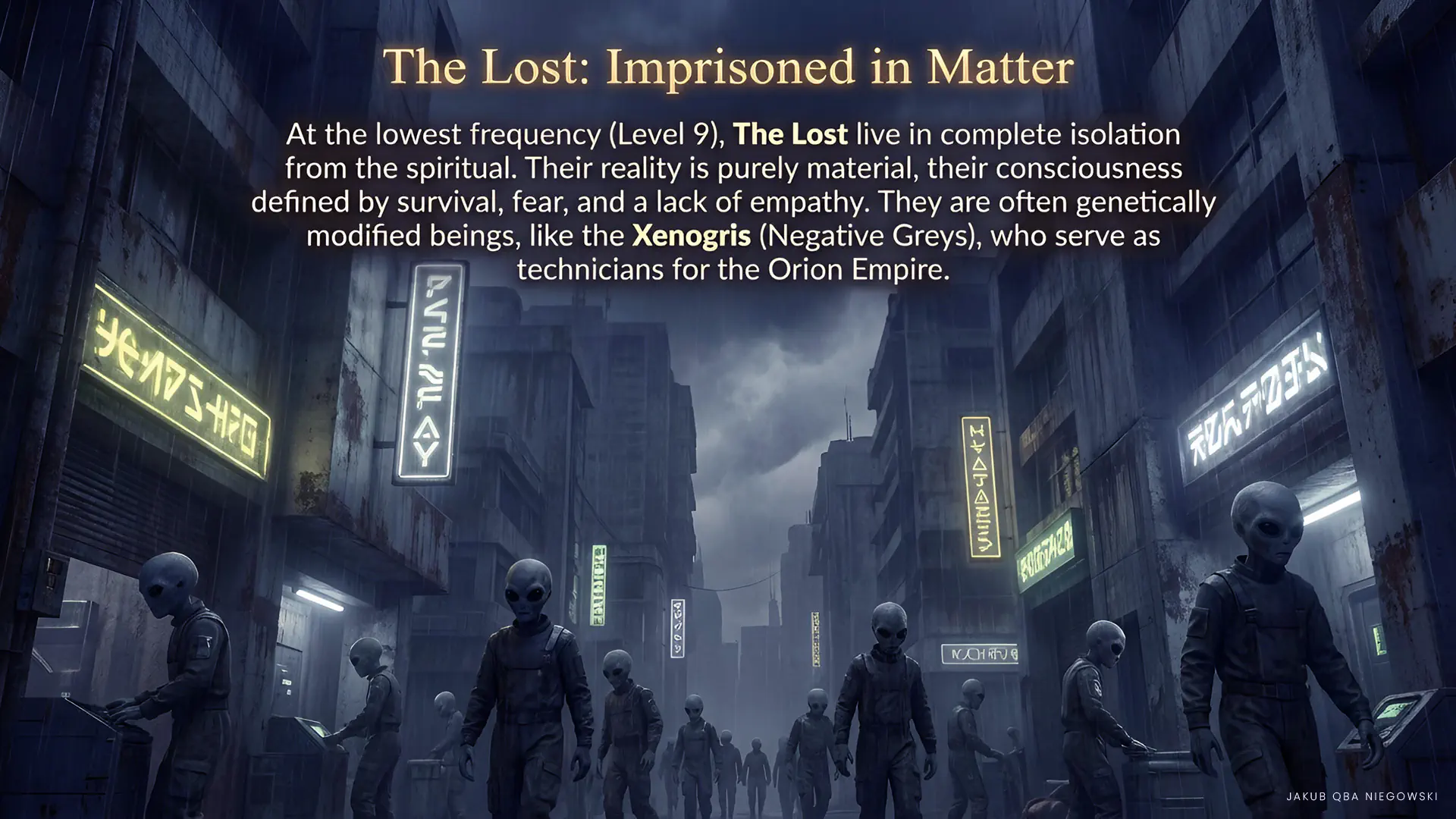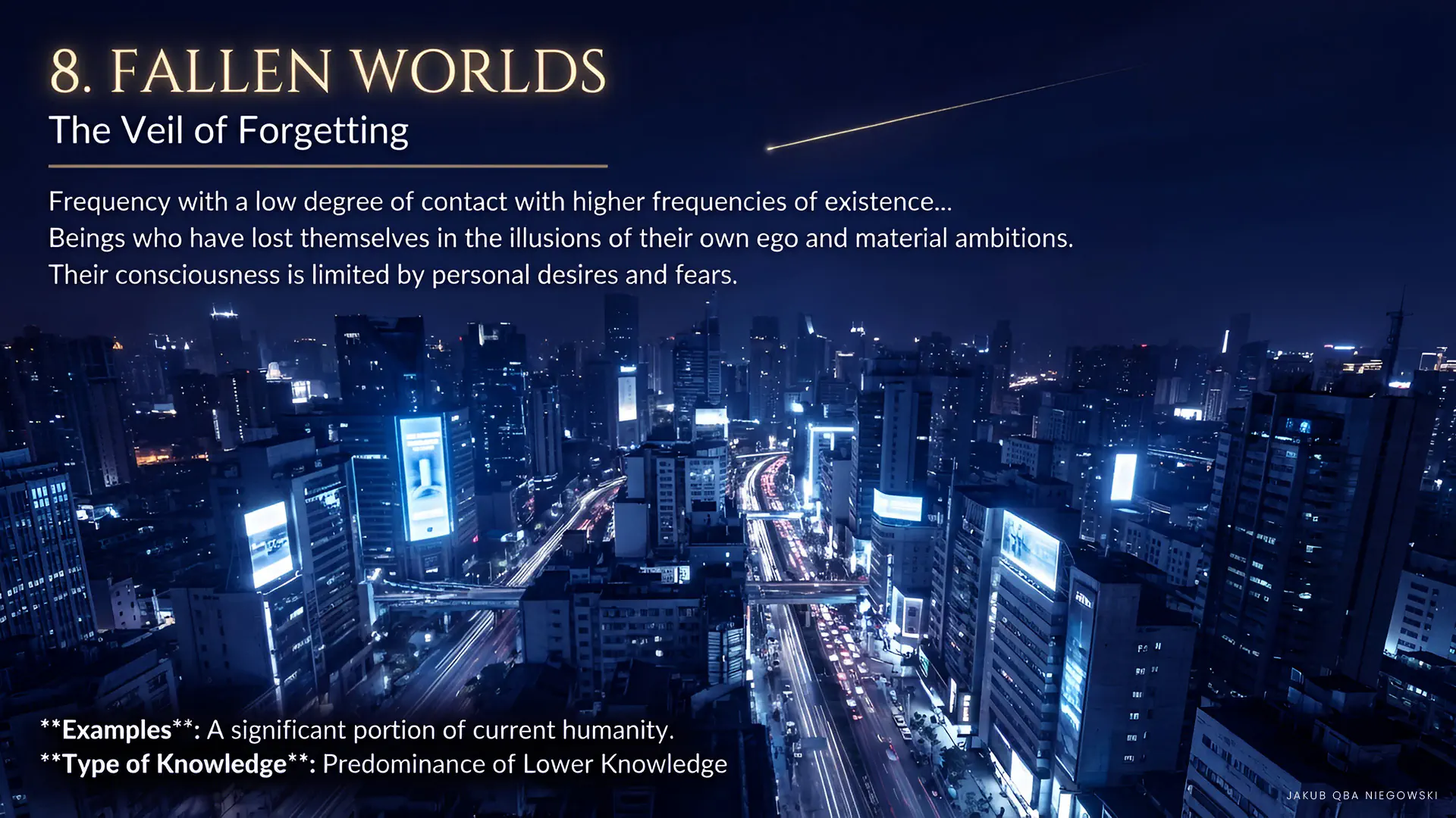 - Description: Frequency with a low degree of contact with higher frequencies of existence and low receptivity to higher ideas and energies. Beings who have lost themselves in the illusions of their own ego and material ambitions. Their consciousness is limited by personal desires and fears.