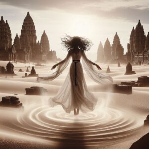 Vestuário: Vestido branco muito fluido e muito longo, alargado na parte inferior, cingido por uma corda escura na cintura, faixa no cabelo